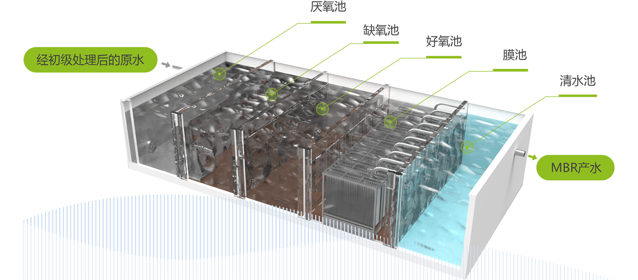傳統MBR技術具有産水水質優和占地面(miàn)積省等特點,被(bèi)廣泛應用于污水處理系統的三級處理工藝。與此同時(shí),傳統MBR技術在應用過(guò)程中普遍存在著(zhe)運行能(néng)耗高和清洗頻率高等共性問題。基于上述問題,美能(néng)環保對(duì)傳統MBR技術進(jìn)行了系統、全面(miàn)的改良設計,針對(duì)性地開(kāi)發(fā)了改良MBR技術,旨在顯著提升了MBR技術的運行效率和抗污染能(néng)力。
