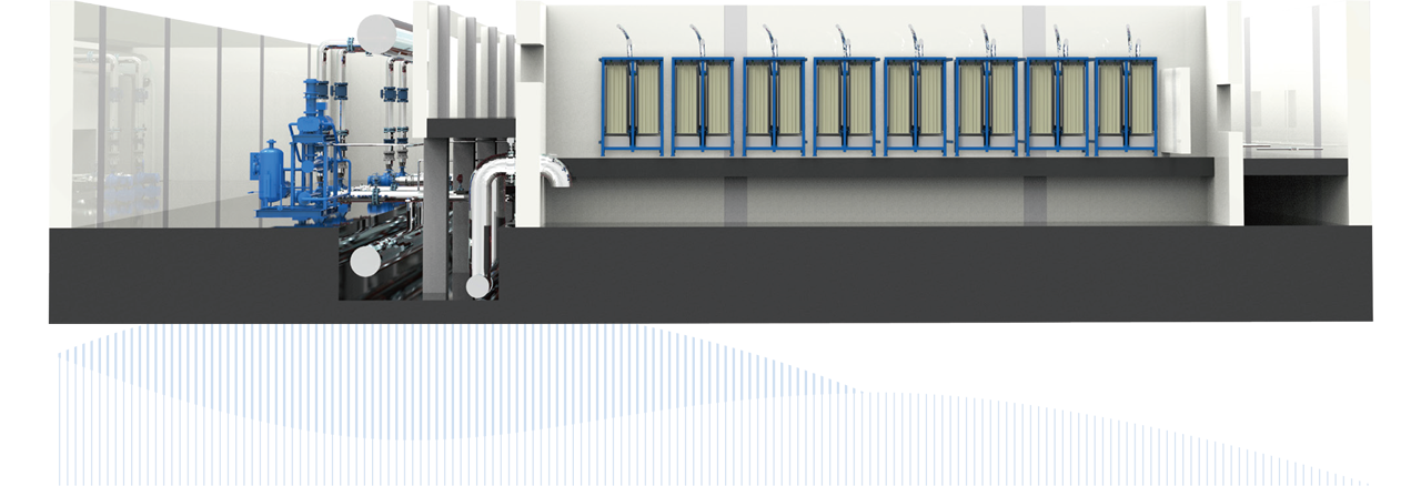 壓力式超濾之外的另一種(zhǒng)超濾應用形式,與壓力式超濾具有相同的應用效果,以負壓或重力為驅動力,具有運行成(chéng)本低、對(duì)進(jìn)水水質要求低等優點。基于超濾技術優異的機械分離能(néng)力,其廣泛應用于大規模的市政、工業等領域的原水處理或污水資源化、自來水處理、反滲透系統進(jìn)水預處理等。